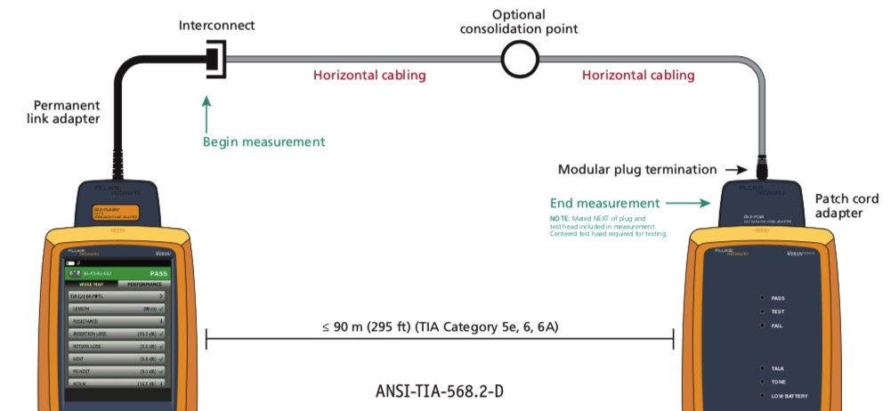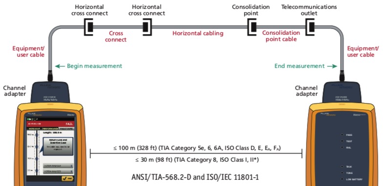 Trong các bài đo kiểm tra, kiểm tra liên kết cố định không bao gồm dây cáp thiết bị vì nó chỉ đo phần cố định của kênh, điển hình là từ bảng đấu nối này đến bảng đấu nối khác trong trung tâm dữ liệu hoặc từ bảng đấu nối trong phòng viễn thông đến ổ cắm khu vực làm việc hoặc điểm hợp nhất trong mạng LAN. Chiều dài tối đa cho phép của liên kết cố định là 90 mét.